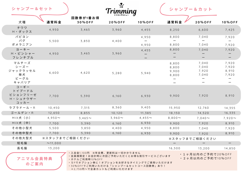 ・1番お得な30%OFFでご利用いただける「シャンプー&セットコース回数券」あり!+2,750円〜で全身カットもご利用いただけます