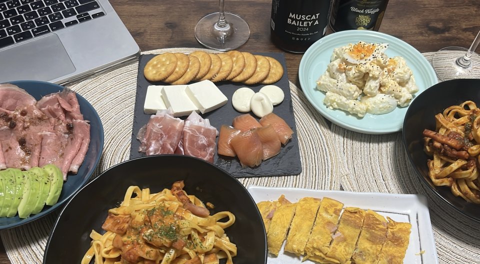 ワインに合いそうなパスタやチーズ、ハムなど沢山