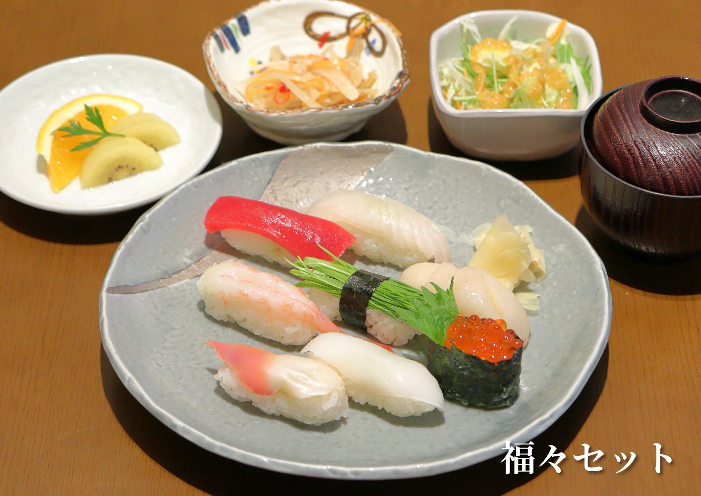 Menu お品書き ランチメニュー 日替わりランチ 悠 握り6貫・サラダ・小鉢・お椀・水菓子 1,100 円 日替わりランチ 粋 握り5貫・小丼ぶり・小鉢・お椀・水菓子 1,100 円 陽だまり 握り7貫・小鉢・サラダ・お椀・水菓子 1,650 円 おまかせ握り8貫 握り8貫・お椀 1,320 円 おまかせ握り並10貫 握り10貫・お椀 1,650 円 メニュー やぐら 握り8貫・巻物・お椀付 2,200 円 はちまき 握り10貫・お椀付 2,200 円 まつり 握り10貫・お椀付 3,080 円 みこし 握り10貫・お椀付 4,180 円 のぼり 握り11貫・お椀付 5,280 円 桃花(とうか)【おまかせ握り】 握り10貫・玉子焼き・お椀・水菓子 3,740 円 牡丹(ぼたん)【おまかせ握り】 握り13貫・玉子焼き・お椀・水菓子 4,950 円 欅(けやき)【おまかせ握り】 握り18貫・玉子焼き・お椀・水菓子 6,160 円 鉄火丼 お椀付 3,080 円 海鮮丼 お椀付 2,200 円 桶ちらし お椀付 4,180 円 のり玉 かんぴょう巻とたまご 880 円 のりいなり かんぴょう巻といなり 880 円 セットメニュー やすらぎセット 握り8貫・小鉢・サラダ・お椀・水菓子 2,200 円 ふくふくセット 握り8貫・小鉢・サラダ・お椀・水菓子 2,640 円 花車セット 握り9貫・小鉢・サラダ・焼魚・お椀・水菓子 3,960 円 コースメニュー 阿武隈(あぶくま)【おまかせコース】 前菜・揚げ物・焼き物・すし他全7品 3,300 円 信夫(しのぶ)【おまかせコース】 前菜・揚げ物・焼き物・刺身・すし他全8品 4,400 円 小富士(こふじ)【おまかせコース】 前菜・揚げ物・焼き物・刺身・すし他全9品 5,500 円 宴会 飲み放題コース(2時間) お料理8品(寿司も含む)※前日まで要予約※4名様以上で利用可能 5,000 円 お好み握り あじ 132 円 〆さば 132 円 すしっこ 132 円 たまご 132 円 いなり 132 円 こはだ 220 円 あおりいか 220 円 やりいか 220 円 わらさ 220 円 もんごういか 220 円 姫ネギ 220 円 特選さば 220 円 たこ 220 円 たい 330 円 ぶり 330 円 ひらめ 330 円 かんぱち 330 円 サーモン 330 円 すずき 330 円 いわし2貫 330 円 げそ2貫 330 円 まぐろ 418 円 づけ 418 円 蒸しえび 418 円 甘えび 418 円 いとより 418 円 ホタテ 418 円 えんがわ 528 円 いくら軍艦 528 円 あなご 528 円 炙りきんめ鯛 528 円 ほっき貝(茹で) 528 円 とろ中おち軍艦 858 円 中とろ 858 円 ぼたん海老 858 円 うに 858 円 赤貝の身と紐 858 円 ずわいがに 858 円 大トロ 1,078 円 特選うに 1,078 円 つぶ貝(生2貫) 1,078 円 ほっき貝(生2貫) 1,078 円 カッパ巻 308 円 干ぴょう巻 308 円 おしんこ巻 308 円 納豆巻 308 円 梅きゅうり巻 308 円 梅しそ巻 308 円 山ごぼう巻 363 円 鉄火巻 880 円 いか納豆巻 770 円 穴子きゅうり巻 770 円 ネギトロ巻 1,540 円 おつまみセット おつまみセット 生ビールまたは日本酒・小鉢3種付 1,540 円 日本酒3種(小鉢付) 6種類からお選びください。 1,210 円 お通し 当店のお通しは注文制でございます 660 円 一品料理(刺身) 刺身3種盛 1人前 1,056 円 刺身5種盛 1人前 1,980 円 刺身盛り合わせ 恵 2人前 3,080 円 刺身盛り合わせ 喜 3~4人前 6,160 円 刺身盛り合わせ 彩 5~6人前 9,240 円 まぐろ 1,078 円 ホッキ貝 1,078 円 〆さば 660 円 平目 1,078 円 つぶ貝 1,078 円 すずき 880 円 アジ 748 円 ホタテ貝 968 円 やりいか 858 円 かんぱち 1,078 円 ぶり 1,078 円 鯛 1,056 円 金目鯛 1,188 円 一品料理(サラダ・焼き物・揚げ物) 野菜サラダ 440 円 海鮮サラダ 990 円 かま塩焼き 858 円 さわら西京焼き 880 円 めひかりから揚げ 528 円 自家製えびしんじょう 1,056 円 穴子天ぷら 858 円 ほっき貝天ぷら 1,078 円 一品料理(その他) たことアスパラのオリーブ炒め 1,078 円 冷や奴 330 円 茶碗蒸し 858 円 玉子焼きつまみ 330 円 いわしの生姜煮 418 円 みそ汁 165 円 ホッキ貝の塩焼き 1,078 円 ガリ つまみ 440 円 げそのわた焼き 462 円 いか生姜焼き 748 円 飲み物(ビール・日本酒) 生ビール 中【ビール】 880 円 生ビール 小【ビール】 660 円 キリンラガー瓶【ビール】 990 円 アサヒスーパードライ瓶【ビール】 990 円 キリンノンアルコールビール【ビール】 594 円 金水晶 純米酒1合【日本酒】 726 円 栄川 純米酒1合【日本酒】 726 円 東豊国 純米酒(超)1合【日本酒】 770 円 大七 純米生もと1合【日本酒】 880 円 大和川 弥右衛門 純米辛口1合【日本酒】 880 円 花春 結芽の奏 純米大吟醸1合【日本酒】 990 円 開当 男山 純米酒1合【日本酒】 924 円 からはし 純米吟醸 夢の香1合【日本酒】 1,166 円 田村 生もと純米酒1合【日本酒】 1,166 円 玄宰 特別純米酒1合【日本酒】 1,166 円 国権 純米吟醸酒【日本酒】 1,100 円 大七 皆伝 純米吟醸酒1合【日本酒】 1,760 円 ふぐひれ酒【日本酒】 858 円 つぎ酒【日本酒】 572 円 飲み物(焼酎・ウイスキー) (麦)一粒の麦(シングル)【焼酎】 ロック・水割り・お湯割り・ソーダ割り+50円 495 円 (麦)一粒の麦(ダブル)【焼酎】 ロック・水割り・お湯割り・ソーダ割り+50円 880 円 (麦)銀座のすずめ(シングル)【焼酎】 ロック・水割り・お湯割り・ソーダ割り+50円 550 円 (麦)銀座のすずめ(ダブル)【焼酎】 ロック・水割り・お湯割り・ソーダ割り+50円 990 円 (芋)克(シングル)【焼酎】 ロック・水割り・お湯割り・ソーダ割り+50円 550 円 (芋)克(ダブル)【焼酎】 