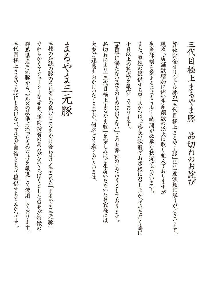 三代目まるやま豚が品薄状態のため、かつ丸郡山新さくら通り店、かつ丸富田店、かつ丸福島西バイパス店では「極上メニュー」のお取り扱いを一時お休みさせて頂きます。