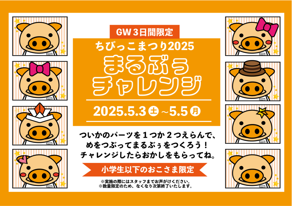 かつ丸、まるやま、まる家各店では2025年5月3日(土)~5月5日(月)の3日間に毎年恒例の『ちびっこ祭り』を開催いたします。