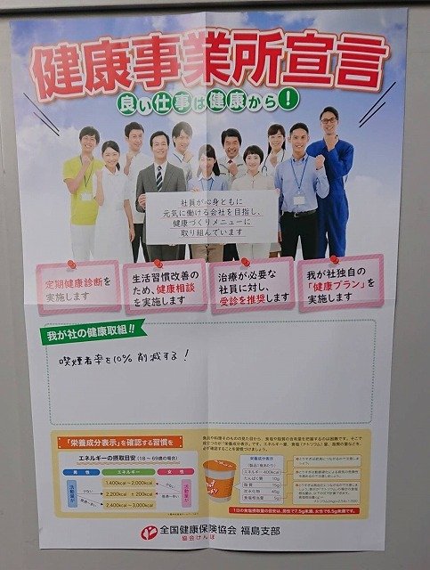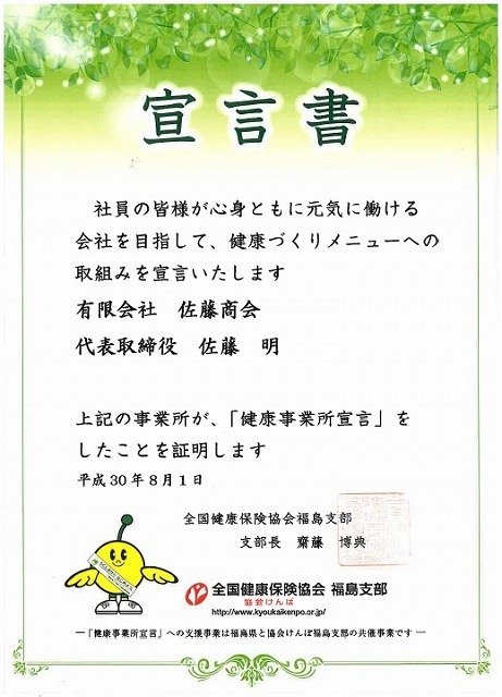 佐藤商会では、協会けんぽ福島支部にて健康事業所宣言を行っております。
