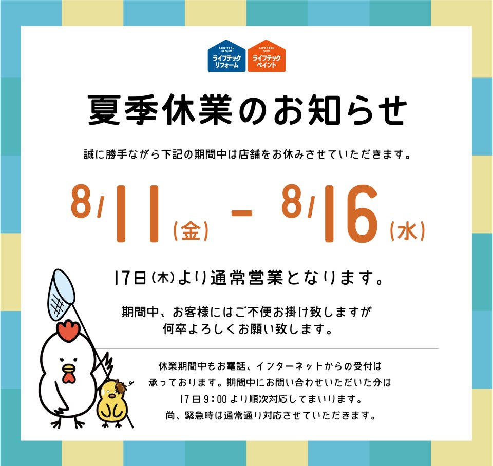 【夏季休業のお知らせ】 誠に勝手ながら下記の期間中、ライフテックサービスでは夏季休業とさせていただきます。 【8月11日(金)~8月...