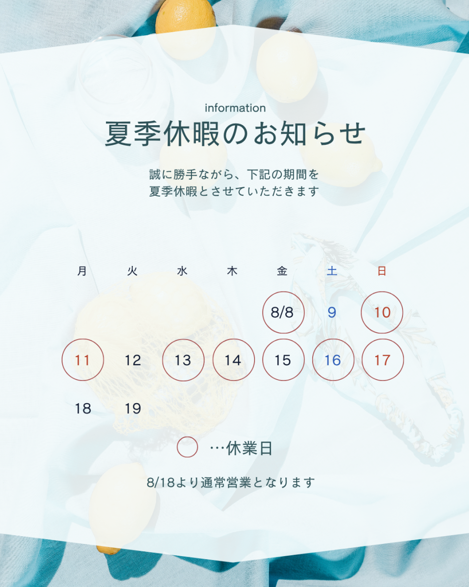以下の通り、8月は一部休業日がございます。ご予約の際はご確認くださいませ。
