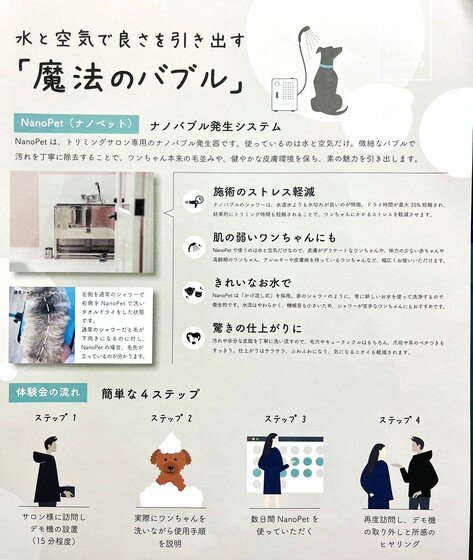 汚れが落ちることでそれに起因する臭いが軽減でき、汚れが落ちた毛はふわふわと立ち上がり、毛玉が少ない仔犬のような毛並みになります。