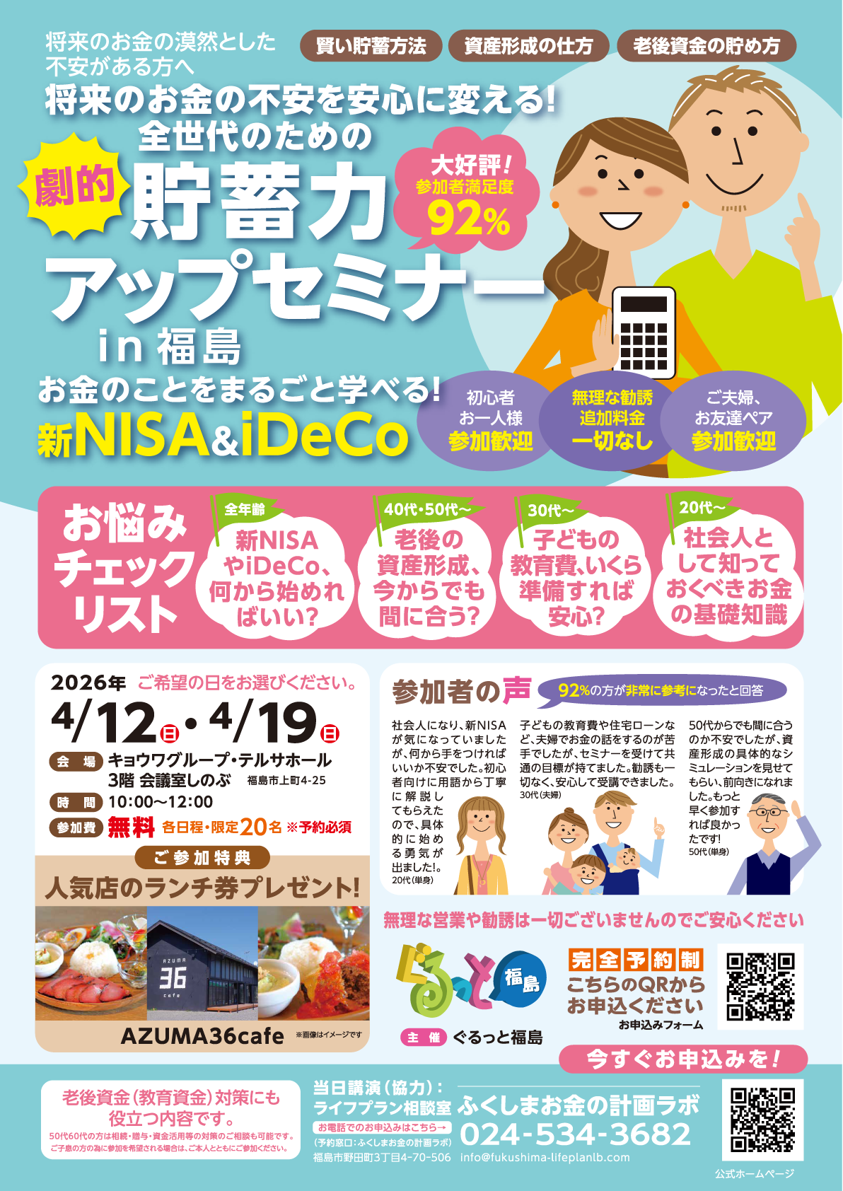 ふくしまお金の計画ラボは、福島の皆様に「理想の人生を送るためのお金の計画」づくりをサポートしています。「教育資金」「住宅資金」「老後資金」「相続問題」等、お金にまつわる問題はそれぞれの世代やライフステージ毎に起こり、個々の状況やニーズに応じて対策をする必要がございます。一人で考え、判断するには難しいと感じていらっしゃる方が安心して将来を考えられる場を提供することをコンセプトに活動して参ります。