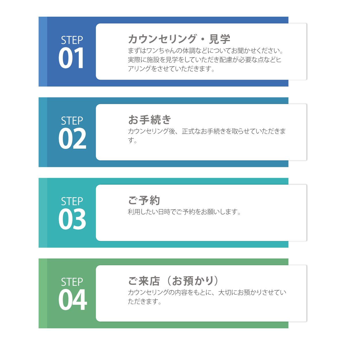 ・老犬や介護が必要なワンちゃんにつきましては、状態に応じて、別途介護料金を頂戴いたします。(料金の目安は、カウンセリング時にご案内いたします)