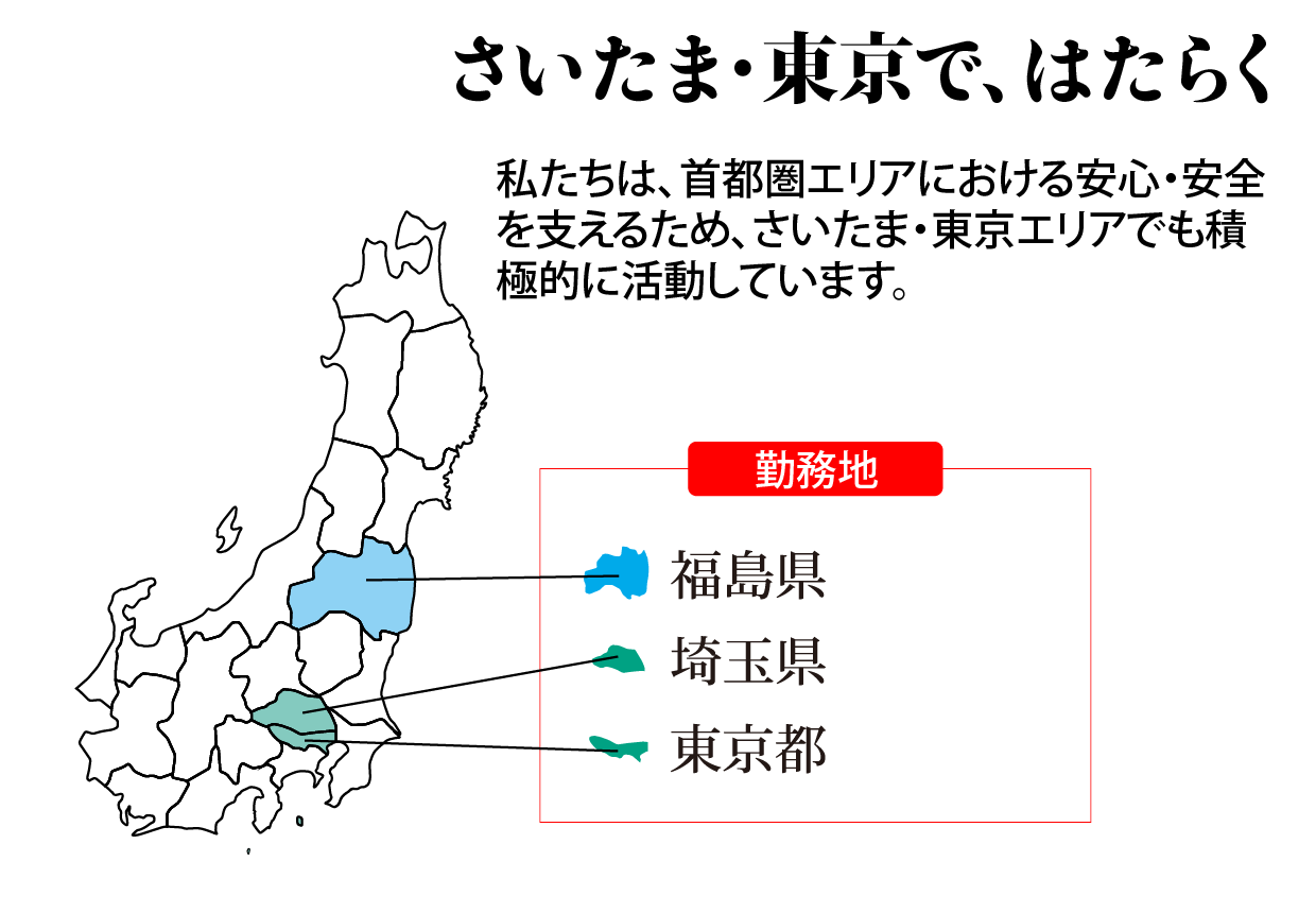 私たち〈日本セキュリティシステム〉は、首都圏における安心・安全を支えるため、さいたま・東京エリアでも積極的に活動しています。県外からの就職も大歓迎で、これまで遠方からご応募いただく方にも「住まい」を整えた上で安心して新生活をスタートしていただける環境をご用意しています。
