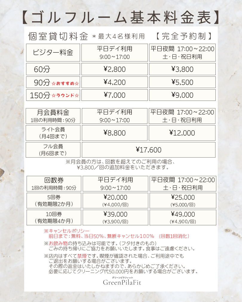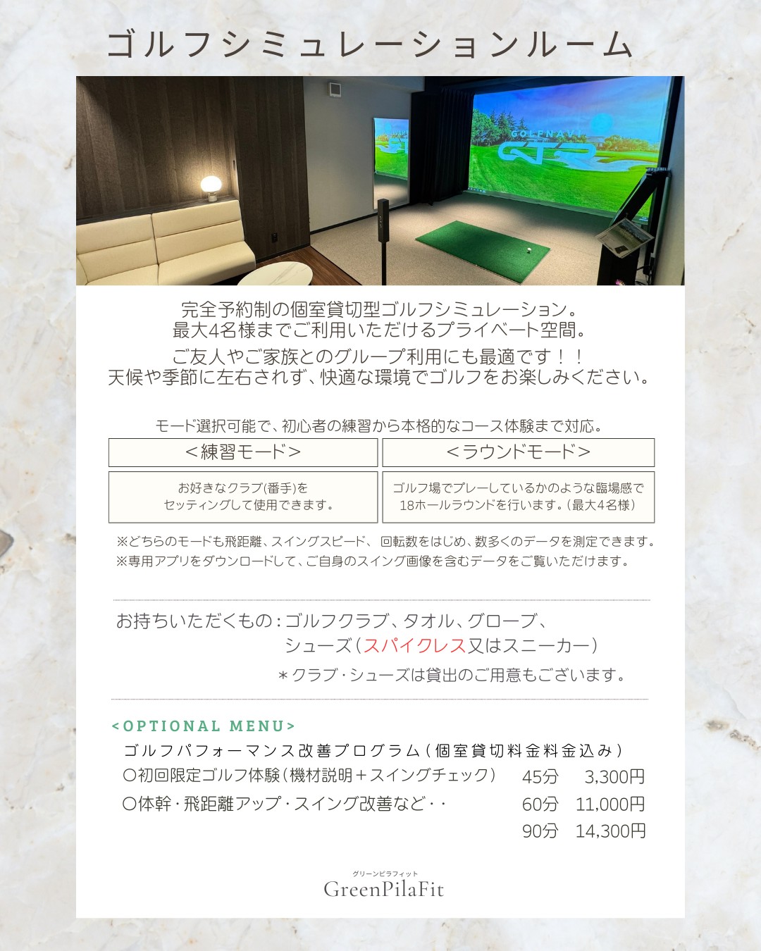 MENU メニュー 全て メニュー・料金表 ① Personal Gym(ボディメイク・ダイエット) 「理想のカラダへ、最短距離で。」 ダイエット、筋力アップ、体力作りなど、お客様の目的に合わせたマンツーマントレーニングを行います。 ジムエリアには、複合型マシン、ケーブルマシン、フリーウェイト、有酸素マシン(トレッドミル)を完備。初心者の方から上級者の方まで、正しいフォームで効果的に鍛えられるよう徹底サポートいたします。 ② Pilates(マシンピラティス・姿勢改善) 「しなやかで美しい、軸のある身体へ。」 カナダ・メリシュー社の最高位機種「V2MAX」を2台導入。 インナーマッスルを鍛え、骨格の歪みを整えることで、美しい姿勢と疲れにくい身体を作ります。マシンピラティスだけでなく、マットピラティスにも対応。激しい運動が苦手な方や、ボディラインを整えたい女性に特におすすめです。 ③ Recovery & Care(整体・施術・リカバリー) 「国家資格者が、痛みと疲労を根本ケア。」 柔道整復師による本格的な施術と、最新の物理療法機器を組み合わせたリカバリーメニューです。(※自費診療のみ) スポーツ外傷の早期回復から、慢性的な肩こり・腰痛、四十肩、首こりまで幅広く対応。骨盤矯正や猫背矯正などの姿勢改善メニューも人気です。 【導入機器】 ラジオ波、超音波、5D立体動態波、ハイボルテージ、マイクロカレント ④ Golf(ゴルフパフォーマンス・練習) 「スイングも、身体の使い方も進化させる。」 最新のゴルフシミュレーションルームを貸切で利用可能。 単なる練習だけでなく、飛距離アップやスイング安定のための「ゴルフトレーニング」も指導します。「ゴルフのために身体を鍛えたい」「ラウンド後の身体のケアをしてほしい」というゴルファーのニーズにワンストップで応えます。 メニュー・料金表