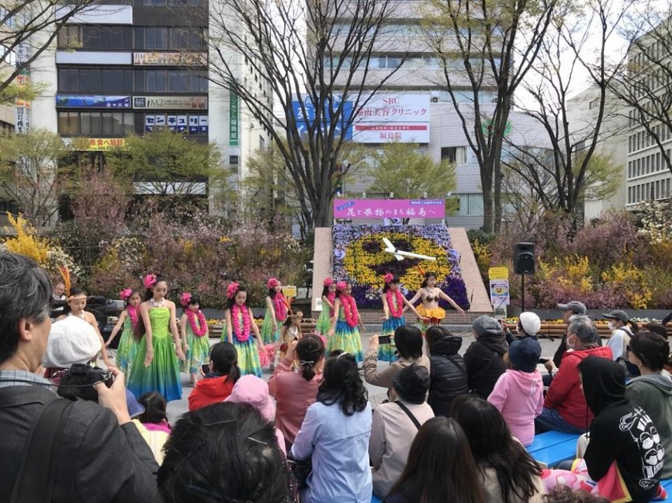 花々に囲まれたステージと、フラダンスの衣装に身を包んだキッズダンサーたちが福島駅前を一段と盛り上げてくれていました。
