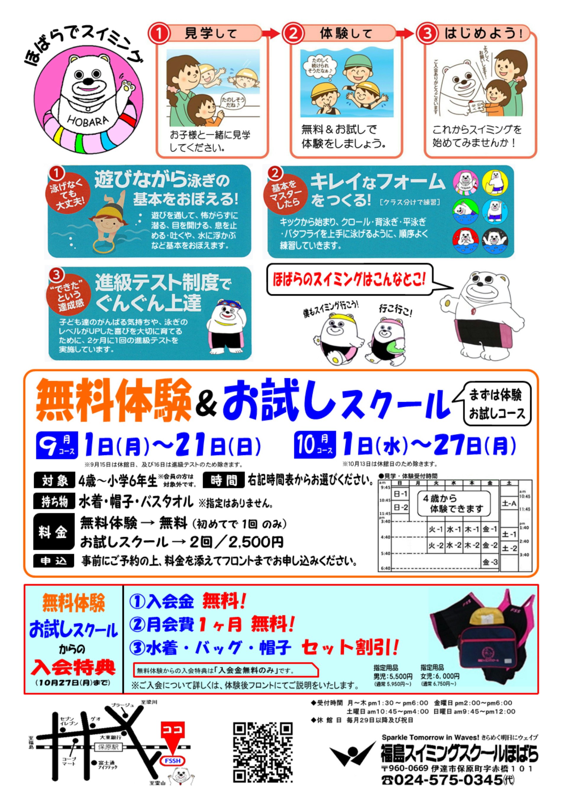 「福島スイミングスクールほばら」では、一人ひとりの年齢や体力、レベルに合わせた最適のカリキュラムで基礎から優しく指導致します。