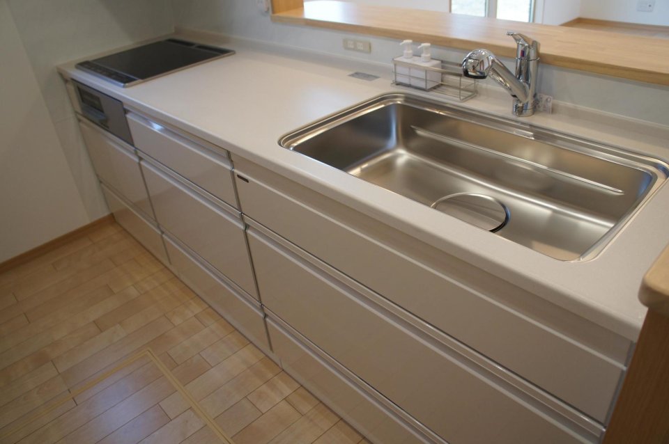 いや~、ピッカピカですね^^ 広々シンクで収納力も高くて、便利な小物も付いていて、お料理好きの女性はやほほーい!ですね^^