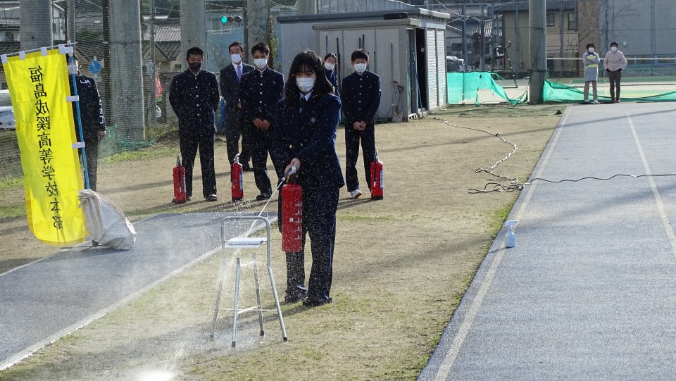 校舎から第1グラウンドまで移動し、整列・点呼の後、校長からの講評、水消火器による消火訓練をおこないました。