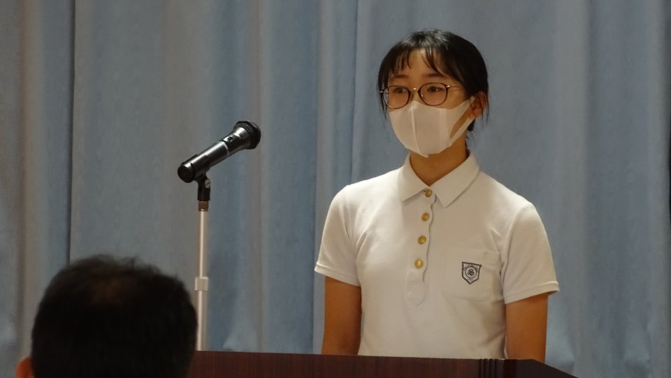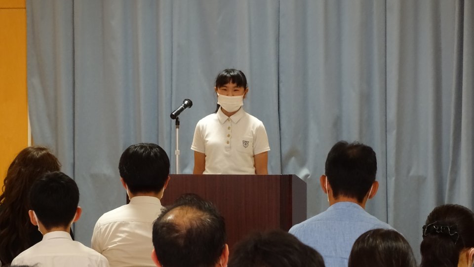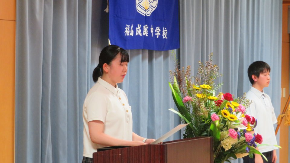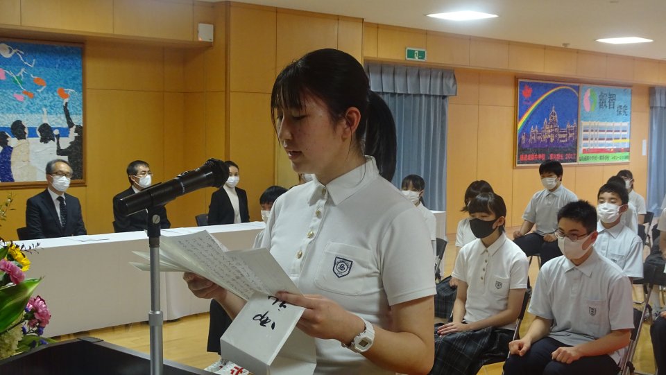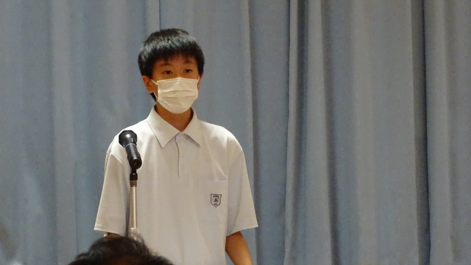 全体会では、中学1年生が学校生活についてスピーチしてくれました。