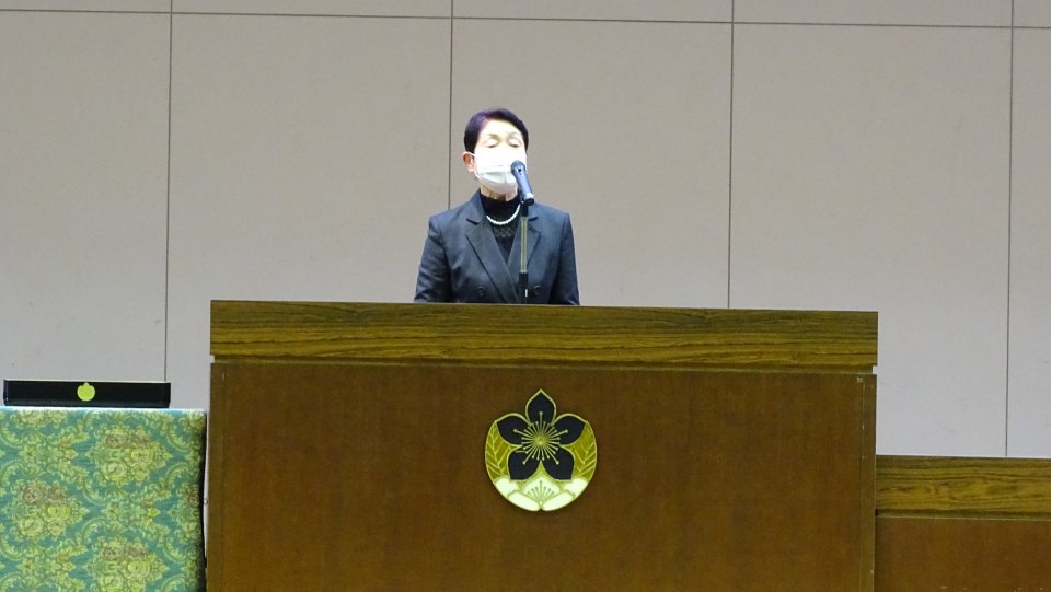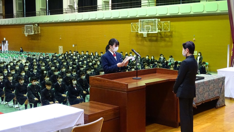 同窓会長、校長に続き、代表生徒が「同窓会生徒の自覚を持ち、母校の発展に寄与したい」とあいさつを述べました。