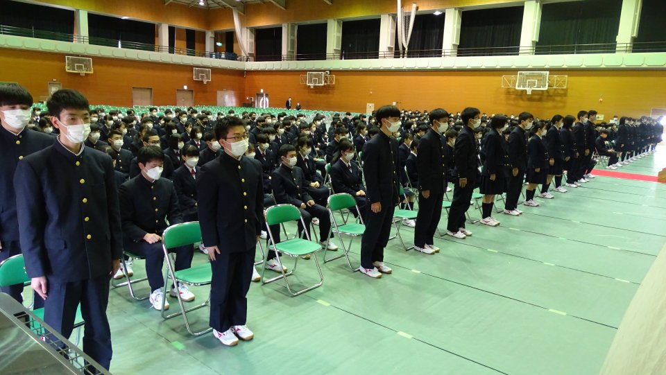 明日に卒業式を控え、高校3年生が卒業準備のため登校。卒業式予行や礼法指導に続き、同窓会入会式が行われました。