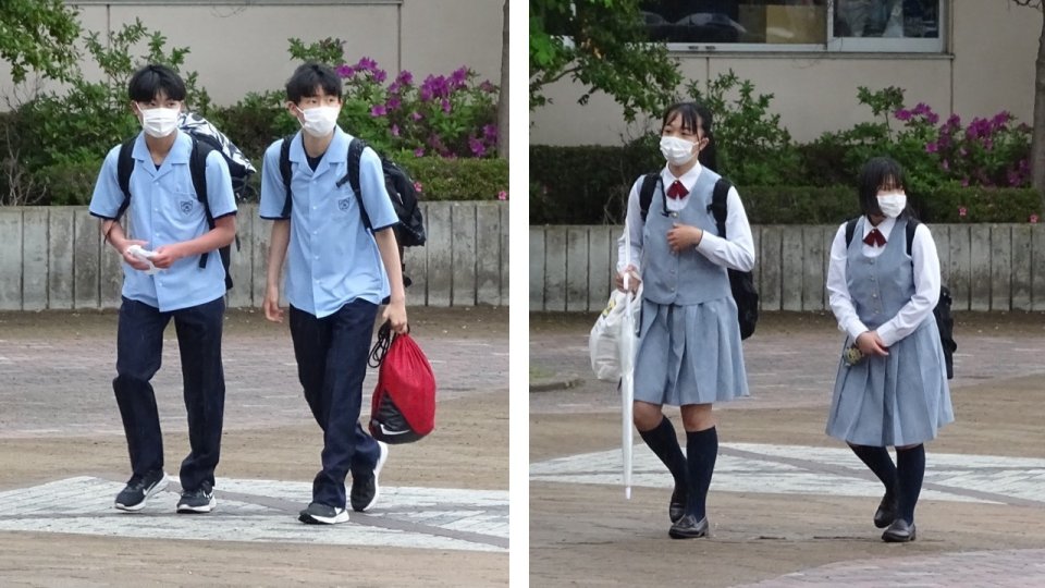 高校生は男子がブルーのオーバーシャツで、涼しく動きやすいデザインです。女子はブルーグレーのスカートとベスト。生徒たちは陰で「銀行員みたい」と言っているようですが、私はどこに出しても恥ずかしくない、清楚で上品なデザインだと思っています。いかがですか?