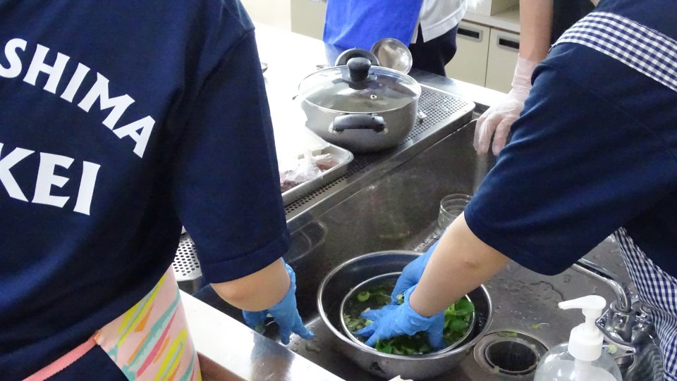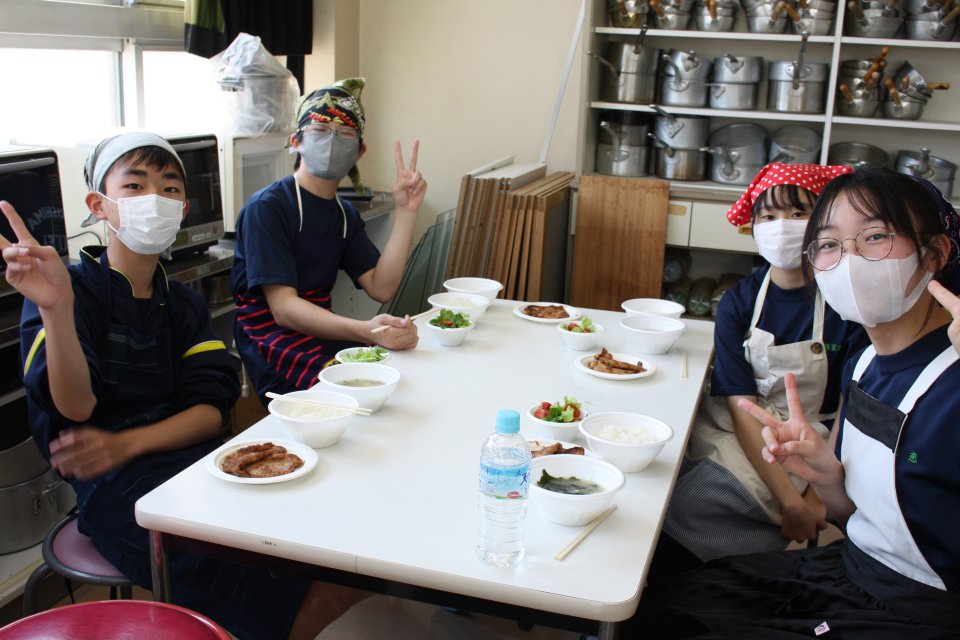 中学2年生の授業は「技術家庭」の「家庭」。上浜キャンパスに移動して、初めての調理実習を行いました。去年は、たびたび蔓延防止重点措置がだされたため、調理および会食はコロナ禍では難しいと判断され、実施できませんでした。今回は、調理台を1台ずつ離し、マスクはもちろん、話は最小限に、手には手袋、食器は使い捨てを利用するなど、さまざまなコロナ対策の中、実施しました。