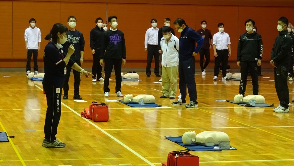 病気や事故などで心停止になった人を救うには、救急車が到着するまでの間に、そばに居合わせた人が速やかに心肺蘇生(そせい)などの応急手当を行うと救命率が高くなります。私たち教員が身につけていれば、日々生活している生徒の「いざ」という時に役立ちます。また、市民としてそばに居合わせた時も何かお役に立つかもしれません。