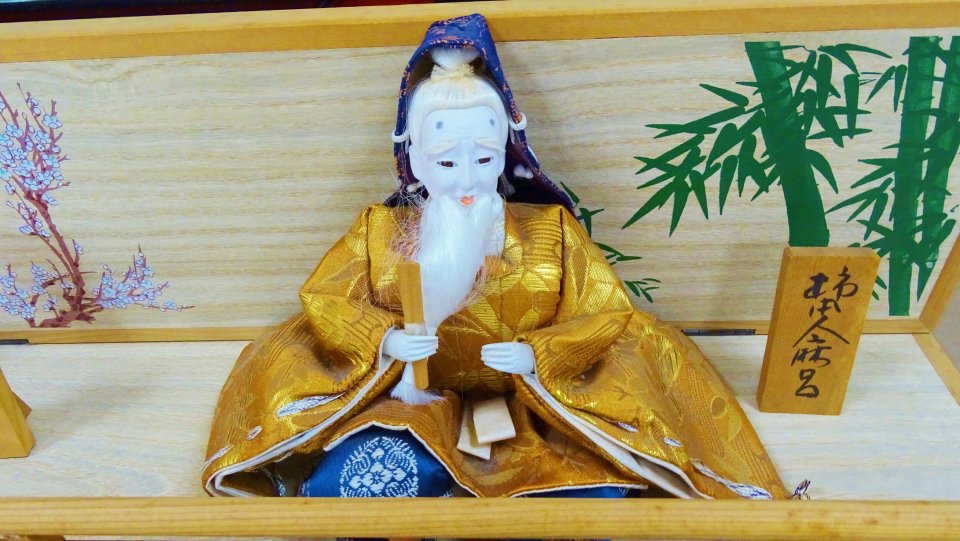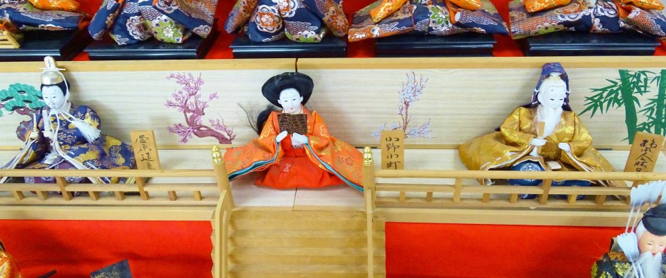 「菅原道真」「小野小町」「柿ノ本人麻呂」という、日本の歴史に名を刻む、日本人ならどこかで名前は聞いたことのある3人です。しかも、背後が豪華な模様の幕になっていたり、段に欄干(手すり?)がついたりと、超VIP待遇です。