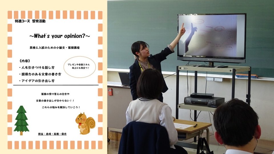 英検や大学入試で必要となってくる「面接」「小論文」について深く追求していきます。プレゼンテーション・自己表現能力は21世紀の社会では不可欠と言われています。アイディアの出し方について考えていました。