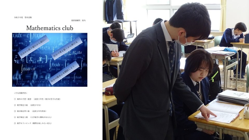 もうとにかく数学が好き!数学をやっていれば幸せ!という数学マニアが集まるチームです。数学検定にもチャレンジし、さらには「全国数学オリンピック」への出場もにらんでいます。この日は数研の問題に取り組んでいました。