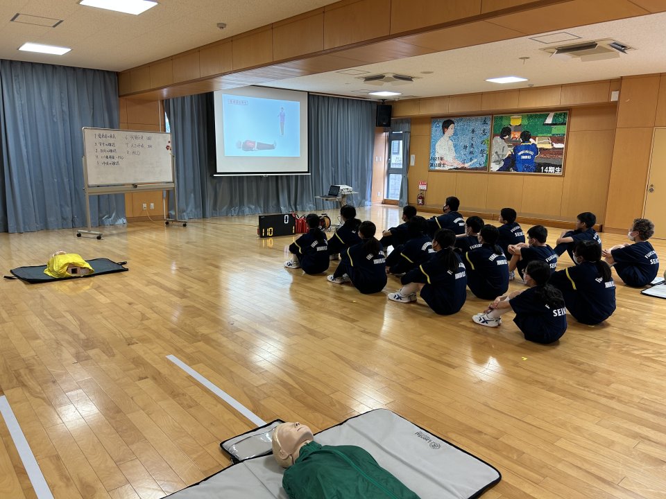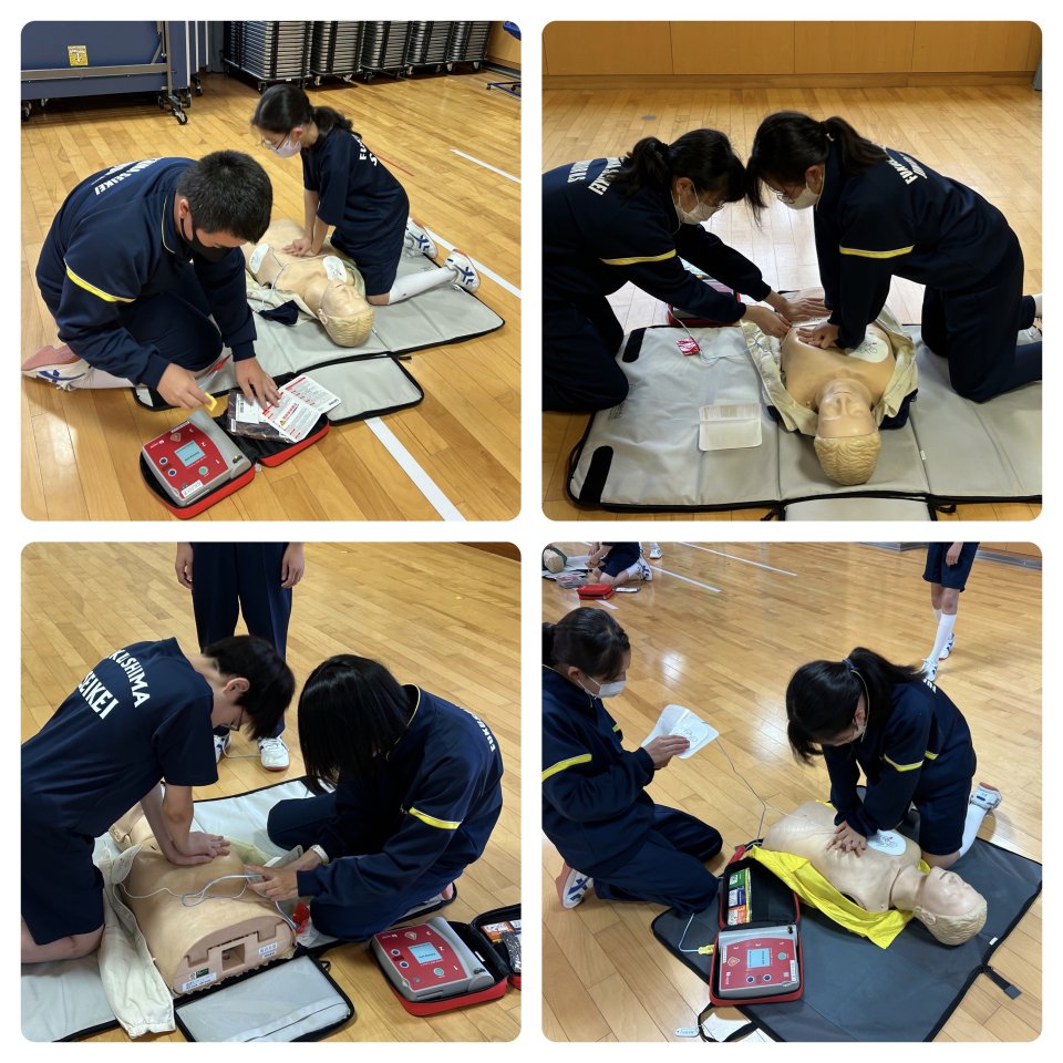 事前指導の一部として、「AEDを用いた心肺蘇生法」の実習をおこないました。