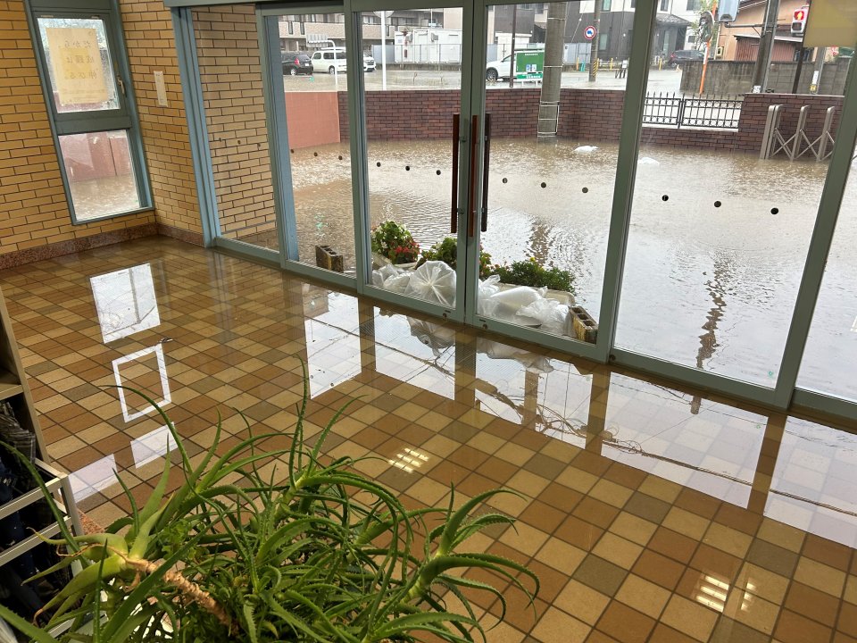 腰浜キャンパス前の道路は冠水し、みるみるうちに昇降口まで水位が上がってきました・・・。