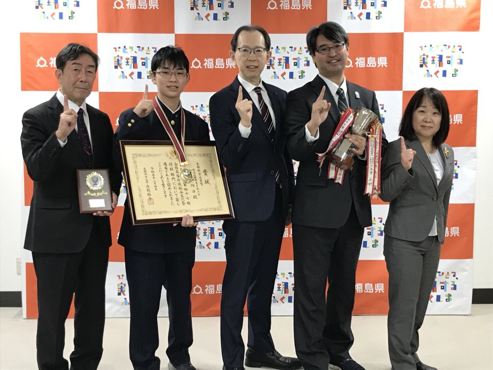 この日は小島くんと、福島県高等学校文化連盟会長の黒川佳子様、本校からは本田哲朗校長、大会を引率した水谷朋之教諭が福島県庁を訪問しました。