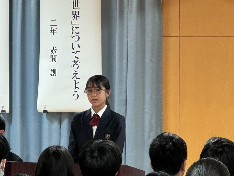 中学1・2年生は、クラス予選を勝ち抜いた生徒が社会の諸問題についての弁論を行いました。