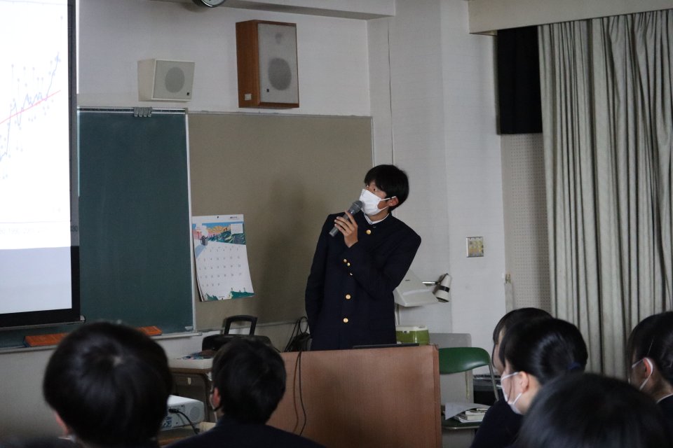 視聴覚室では、1学年文理選抜コースの「探究学年発表会」が行われていました。