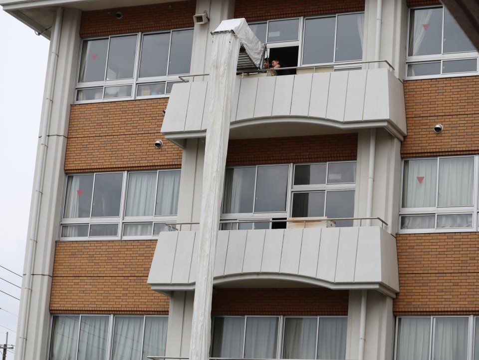 今日はさらに、雨が降らなかったので、数年ぶりに避難袋と避難はしごでの避難の仕方を、先生のパフォーマンスで学ぶことができました。