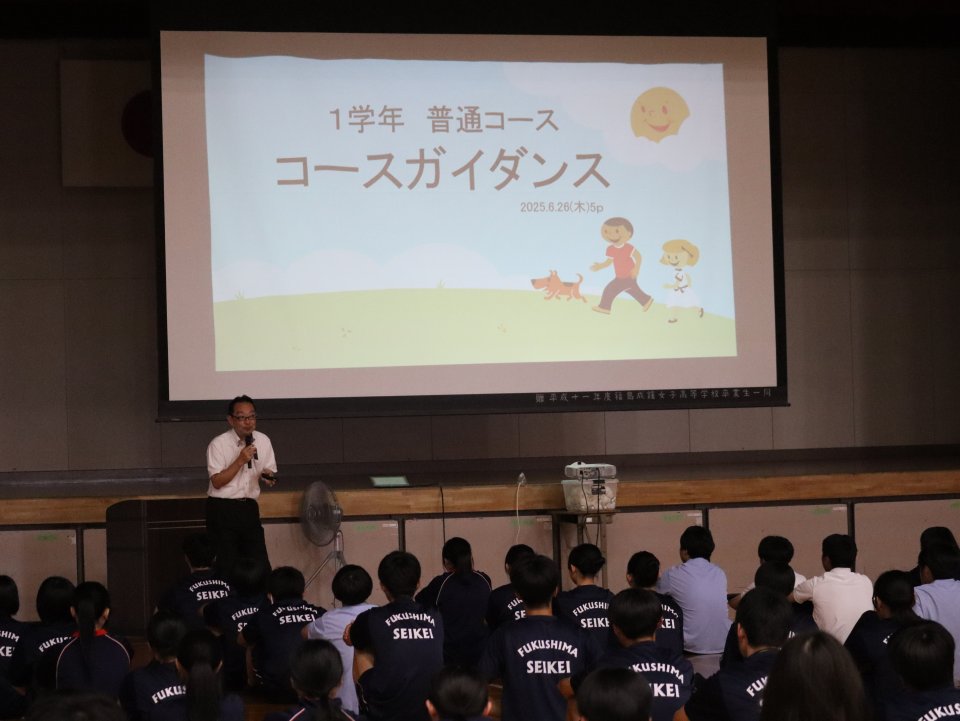 6月26日(木)。5時間目。1年生普通コースの生徒はコース選択についての説明を聞きました。