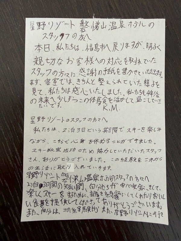あっという間に福島に帰る時間になりました。閉校式では、代表生徒から磐梯山温泉ホテル、ネコママウンテンスキー場への感謝の気持ちを伝えることができました。