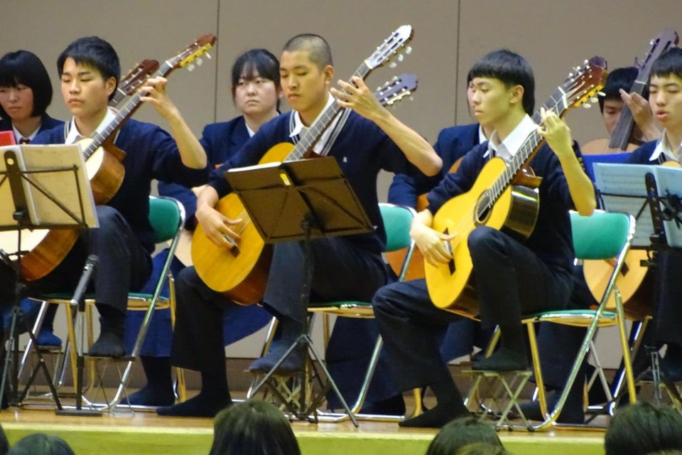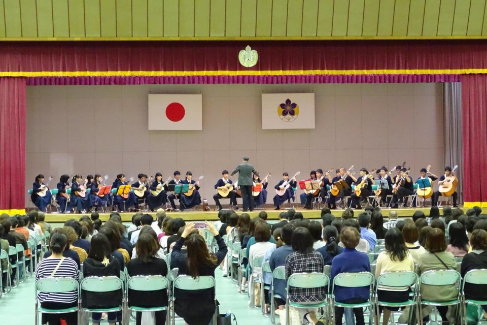 「校歌」にはじまり、皆が知っている「情熱大陸」「残酷な天使のテーゼ」、最後にギターならではの演奏が楽しめる「スパニッシュ・コーヒー」と、4曲を披露し、優雅なひとときを過ごさせてくれました。