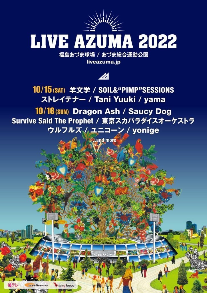 「ライブアズマ 2022」は、西に吾妻小富士を臨む、自然あふれるあづま総合運動公園内で初開催される新音楽フェス。食やアートの入場無料マーケットも設置。公園内のスタジアム周辺には、2021年に「PARK LIFE」として開催した、食・マーケット・アートを主軸とする入場無料エリアも設置。「ハグ クム マルシェ」をキーワードに、福島県及び東北の生産者・販売者・クリエイターが集う。