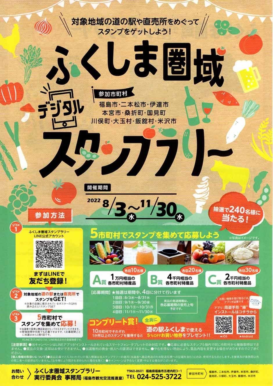 5市町村でスタンプを集めると、月ごとの抽選で1万円相当の各市町村特産品などが当たります。10市町村でスタンプを取得した全員には、福島市の道の駅ふくしまで使える5%オフの買い物券を贈られます。