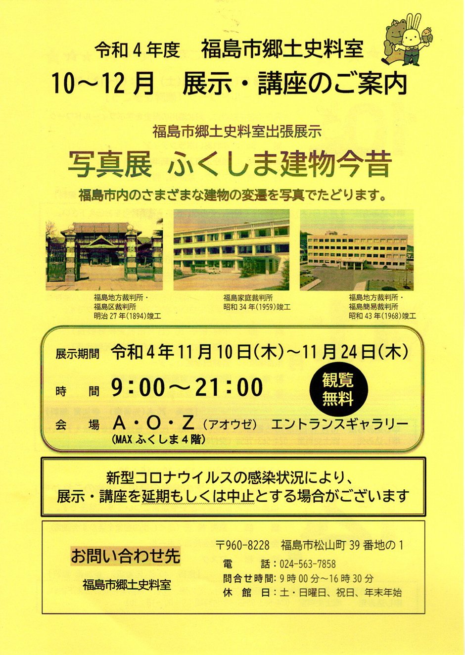 お問い合わせ | アクティブシニアセンター・アオウゼ 〒960-8051 福島市曽根田町1−18 MAXふくしま 024-533-2344 |