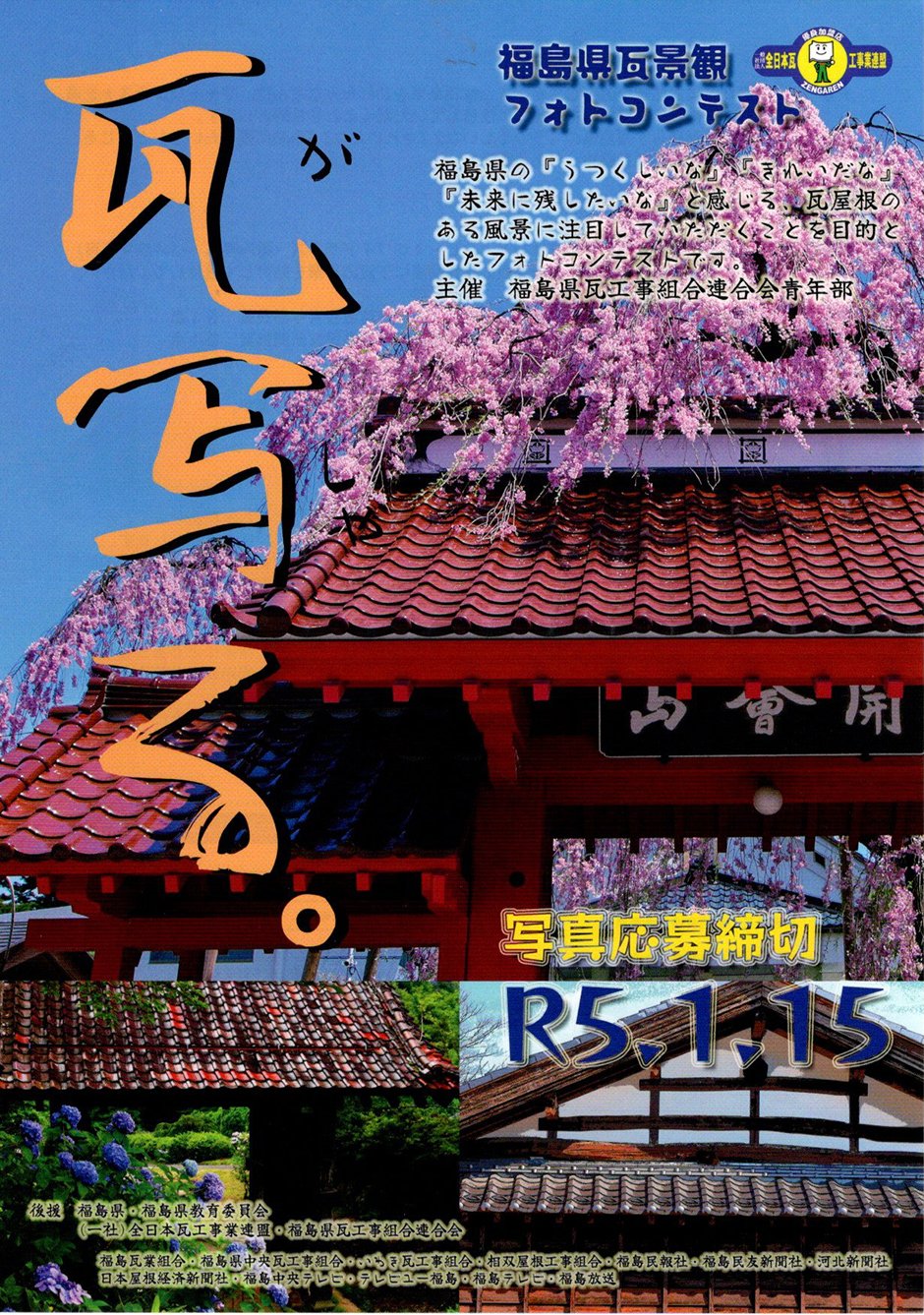 お問い合わせ | 応募先 主催者 福島県瓦工事組合連合会青年部 〒960-0241 福島市笹谷字古屋前4-1 須賀瓦店 |