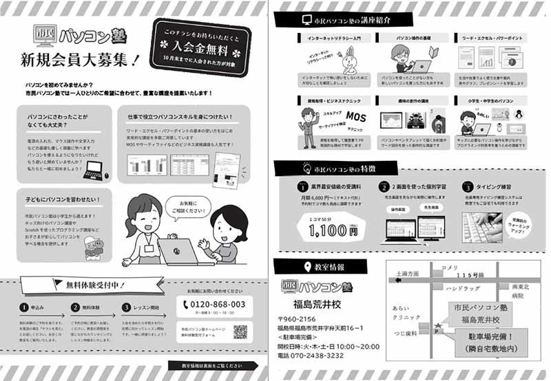 お問い合わせ | 市民パソコン塾 福島荒井校 〒960-2156 福島県福島市荒井 字弁天前16-1 0120-868-003 【問い合わせ先】070-2438-3232 |