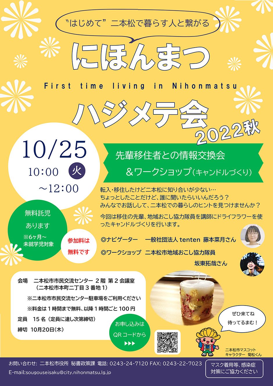 お問い合わせ | 二本松市 市民交流センター 964-0917 福島県二本松市本町2丁目3-1 0243-24-1215 |