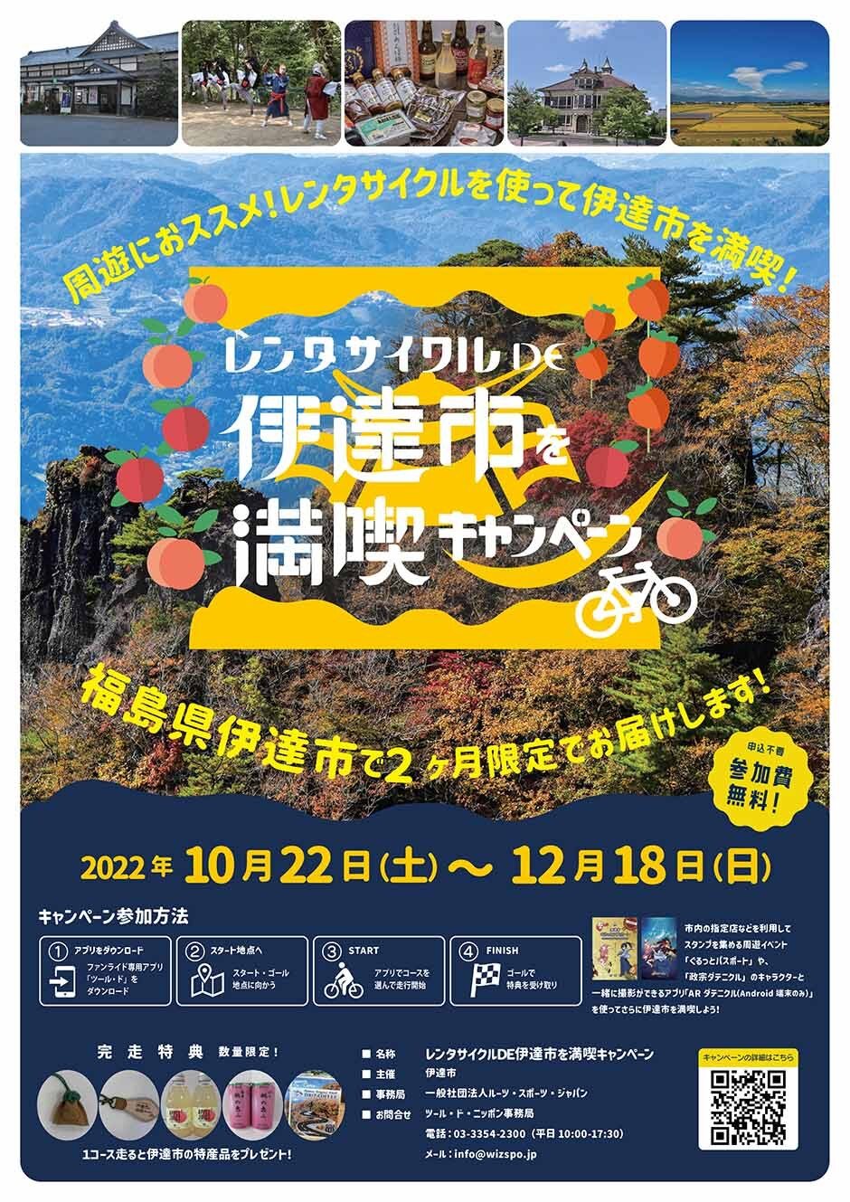 伊達市には、伊達氏の歴史や自然豊かな風景、美味しいものなど様々な魅力があり、自転車で走ることでより身近に魅力を感じることができます。市内5箇所で貸し出しているレンタサイクルやお持ちの自転車でサイクリングアプリ「ツール・ド」を使って、家族や友人と伊達市を満喫しながらサイクリングコースを走ることで、オリジナル記念品がもらえるキャンペーン「レンタサイクルDE伊達市を満喫キャンペーン」です。