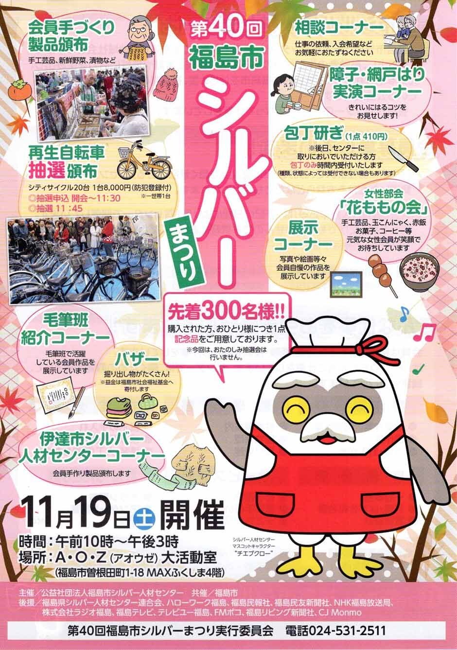 お問い合わせ | お問い合わせ 第40回福島市シルバーまつり実行委員会 TEL 024-531-2511 主催 公益社団法人福島市シルバー人材センター アクティブシニアセンター・アオウゼ 〒960-8051 福島市曽根田町1−18 MAXふくしま 024-533-2344 |
