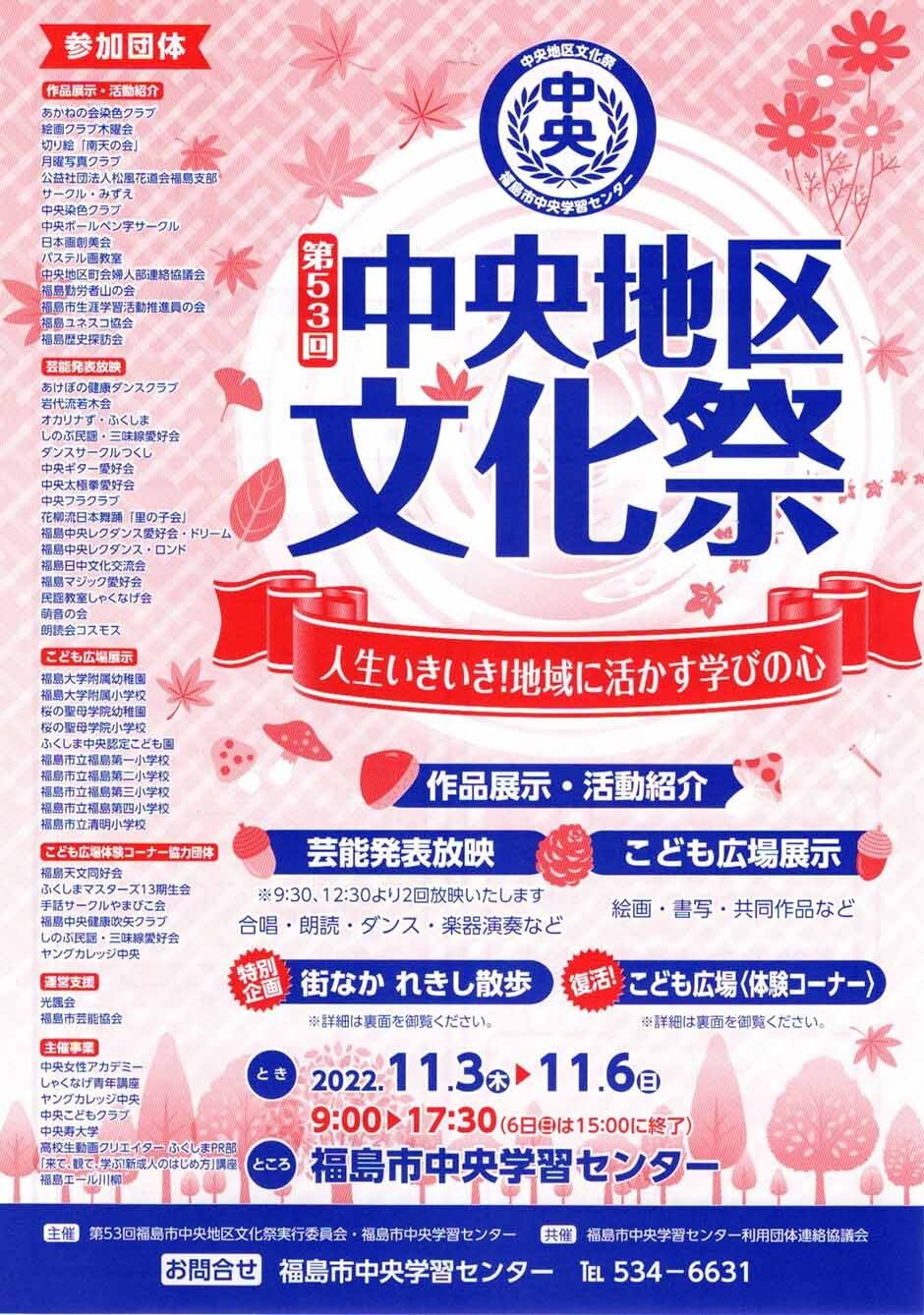 お問い合わせ | ◇お問い合わせ 福島市中央学習センター TEL 024-534-6631 960-8018 福島県福島市松木町1−7 ◇主 催 第53回中央地区文化祭実行委員会・福島市中央学習センター |