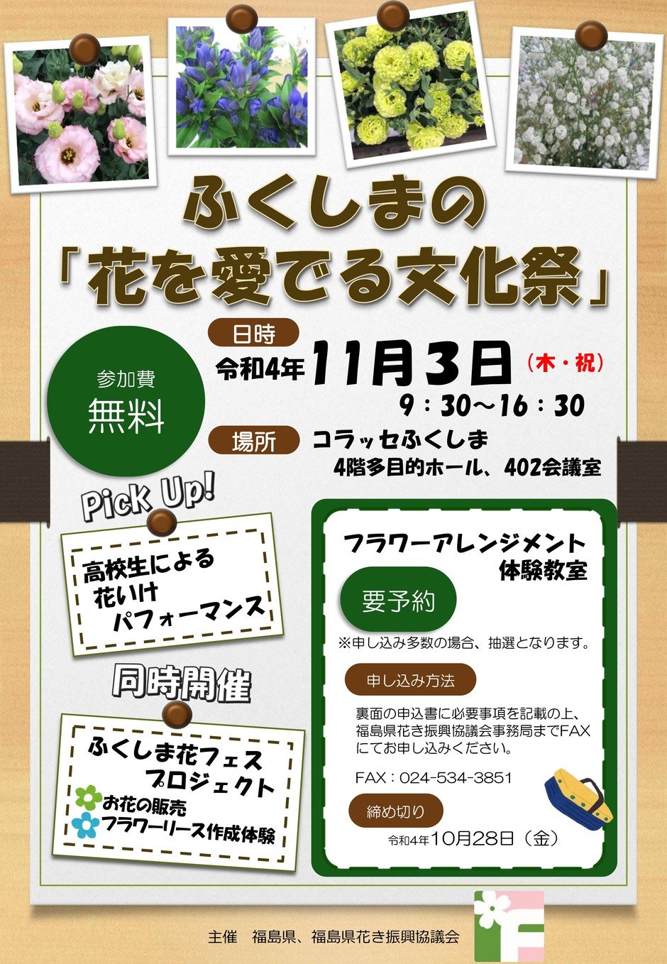 お問い合わせ | 主催/福島県、福島県花き振興協議会 コラッセふくしま4階多目的ホール及び402会議室 960-8053 福島県福島市三河南町1−20 024-525-4098 |