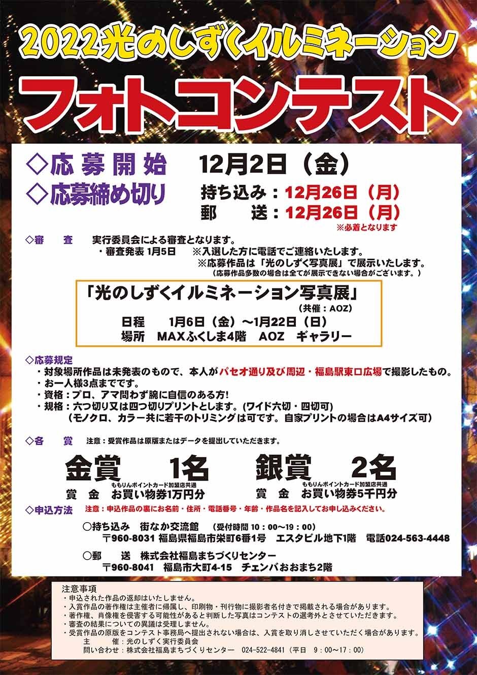 お問い合わせ | お問い合わせ先 光のしずく事業実行委員会(福島まちづくりセンター) 960-8041 福島市大町4-15 チェンバおおまち2階 TEL:024-522-4841(平日:9:00~17:00) アクティブシニアセンター・アオウゼ 〒960-8051 福島市曽根田町1−18 MAXふくしま 024-533-2344 |