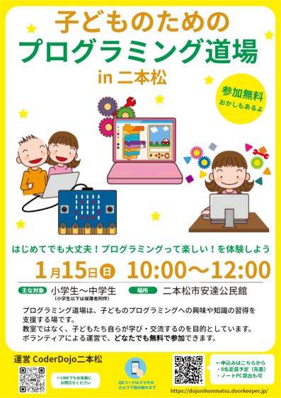 お問い合わせ | CoderDojo二本松 代表:丹治慶太 公式サイト:https://coderdojo-nihonmatsu.com/ Mail:nihonmatsu_cec.jp@coderdojo.com Twitter:https://twitter.com/DojoNihonmatsu Instagram:https://www.instagram.com/coderdojo_nihonmatsu/ LINE:https://lin.ee/4s0nf95 |