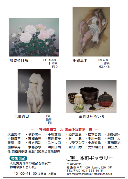 お問い合わせ | 本町ギャラリー info-motomachi@tkc21art.sakura.ne.jp 024-563-3915 |