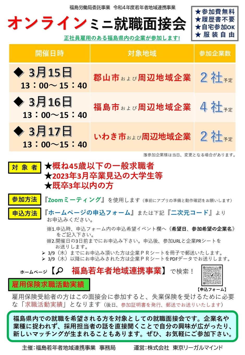 お問い合わせ | 福島若年者地域連携事業事務局 <受託企業> 株式会社東京リーガルマインド 住所:〒980-0022 宮城県仙台市青葉区五橋1丁目1番10号 第二河北ビル4階 Mail:fuku-jakunen@lec.co.jp TEL:080-4913-7824(担当 高橋) 受付:平日10:00~17:00(土日祝は休み) |