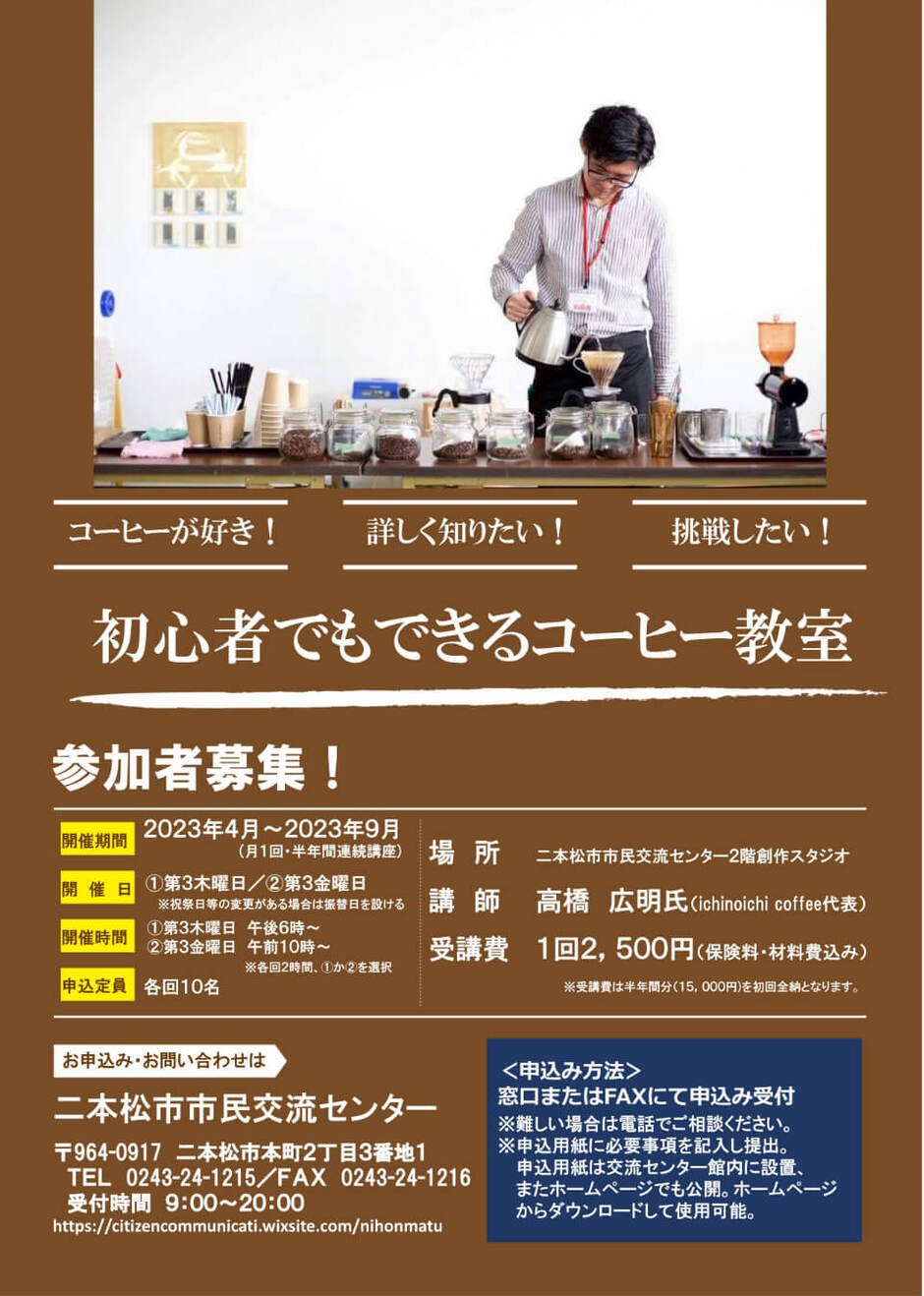 | お問い合わせ | 二本松市市民交流センター(指定管理者:NPO法人まちづくり二本松) TEL:0243-24-1215 FAX:0243-24-1216 受付時間:午前9時~午後8時 |